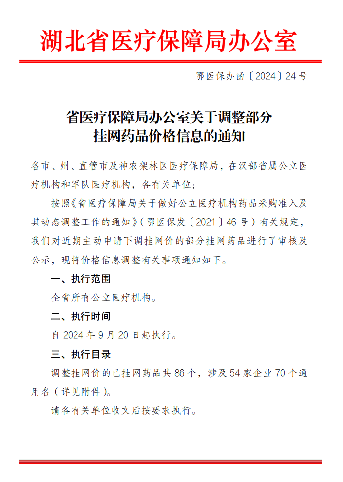 【鄂州】《省医疗保障局办公室关于调整部分挂网药品价格信息的通知》(鄂医保办函〔2024〕24 号)