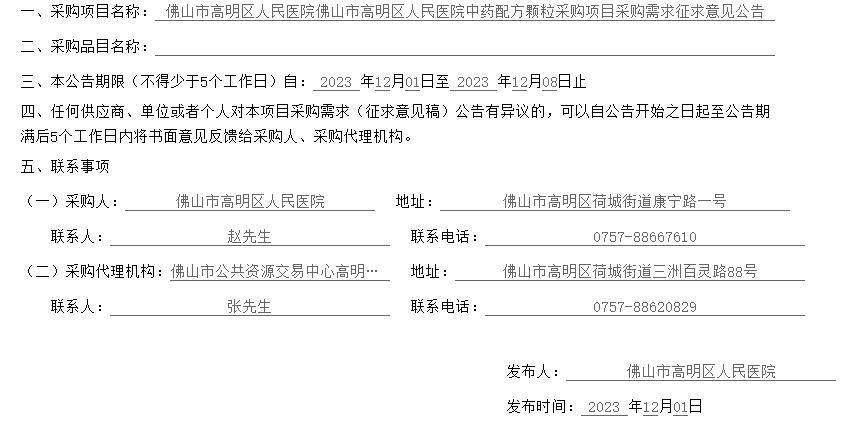 【佛山市高明区人民医院】广东省佛山市高明区人民医院佛山市高明区人民医院中药配方颗粒采购项目采购需求征求意见公告