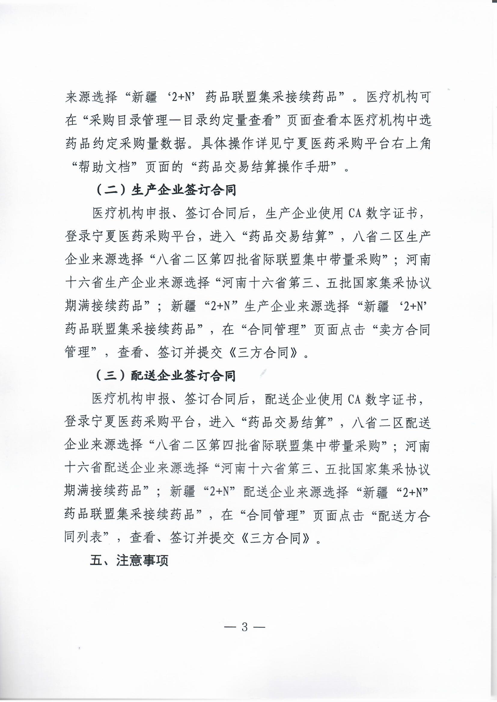 河南十六省第三、五批国家集采协议期满接续药品、新疆“2+N”药品联盟集采接续药品配送关系维护及《宁夏回族自治区国家组织药品集中采购中选药品购销三方合同》(以下简称《三方合同》)签订工作,具体事项通知如下。