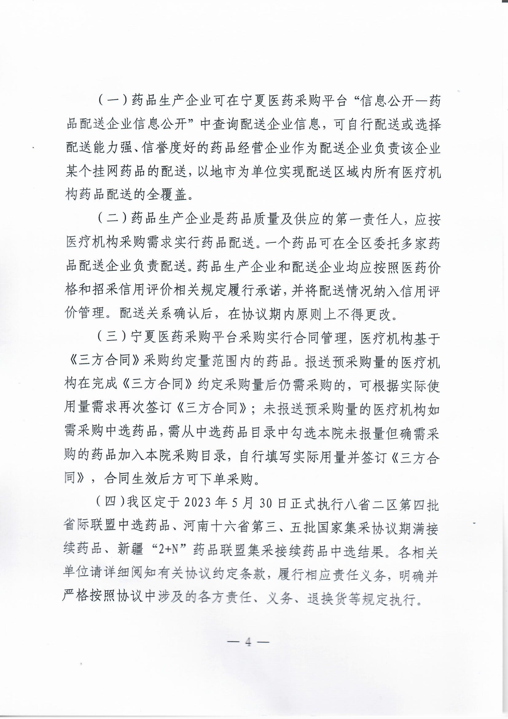 (四)我区定于2023年5月30日正式执行八省二区第四批省际联盟中选药品、河南十六省第三、五批国家集采协议期满接续药品、新疆“2+N”药品联盟集采接续药品中选结果。各相关单位请详细阅知有关协议约定条款,履行相应责任义务,明确并严格按照协议中涉及的各方责任、义务、退换货等规定执行。