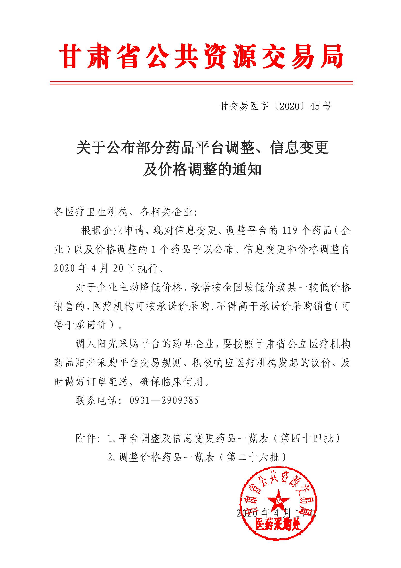 【甘肃】甘肃省关于公布部分药品平台调整、信息变更及价格调整的通知(20200417)