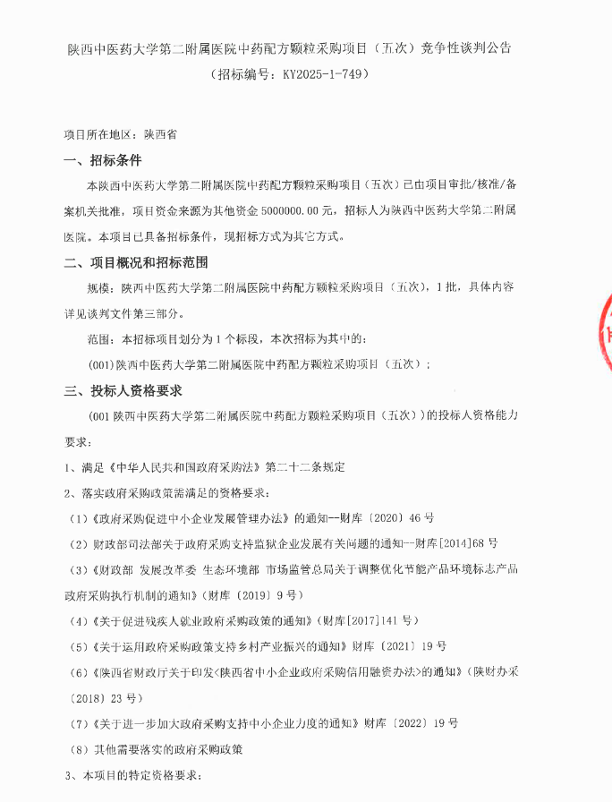 【陕西中医药大学第二附属医院】陕西中医药大学第二附属医院中药配方颗粒采购项目(五次)竞争性谈判公告