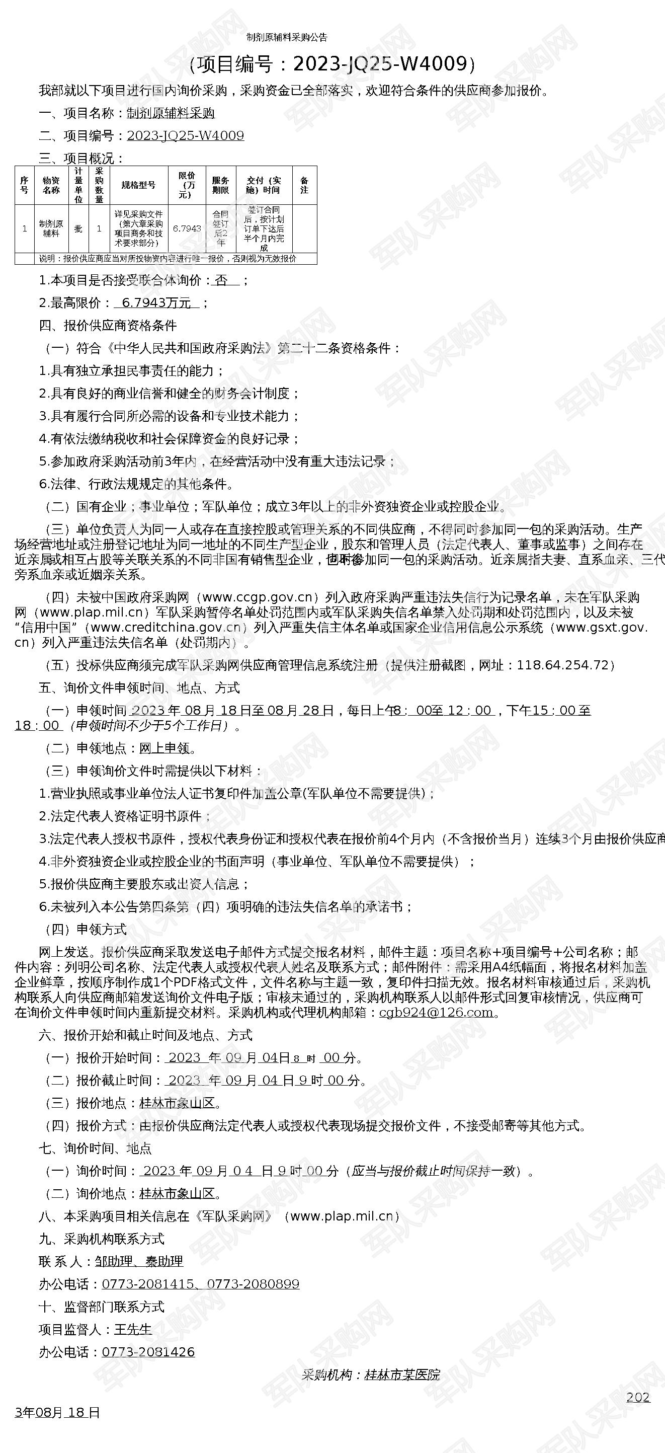 【军队采购】军队采购网制剂原辅料采购公告(2023-JQ25-W4009)