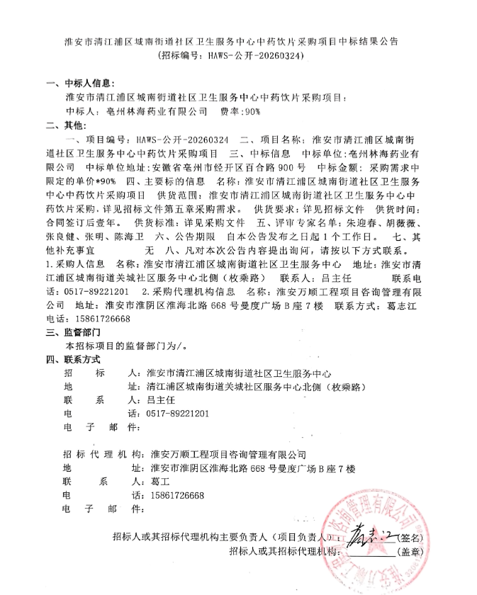 【淮安市清江浦区城南街道社区卫生服务中心】江苏省淮安市清江浦区城南街道社区卫生服务中心中药饮片采购项目中标结果公告
