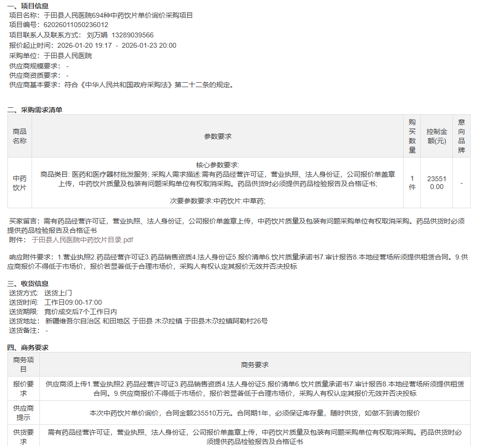 【和田地区于田县人民医院】新疆维吾尔自治区和田地区于田县人民医院694种中药饮片单价询价采购项目竞价公告