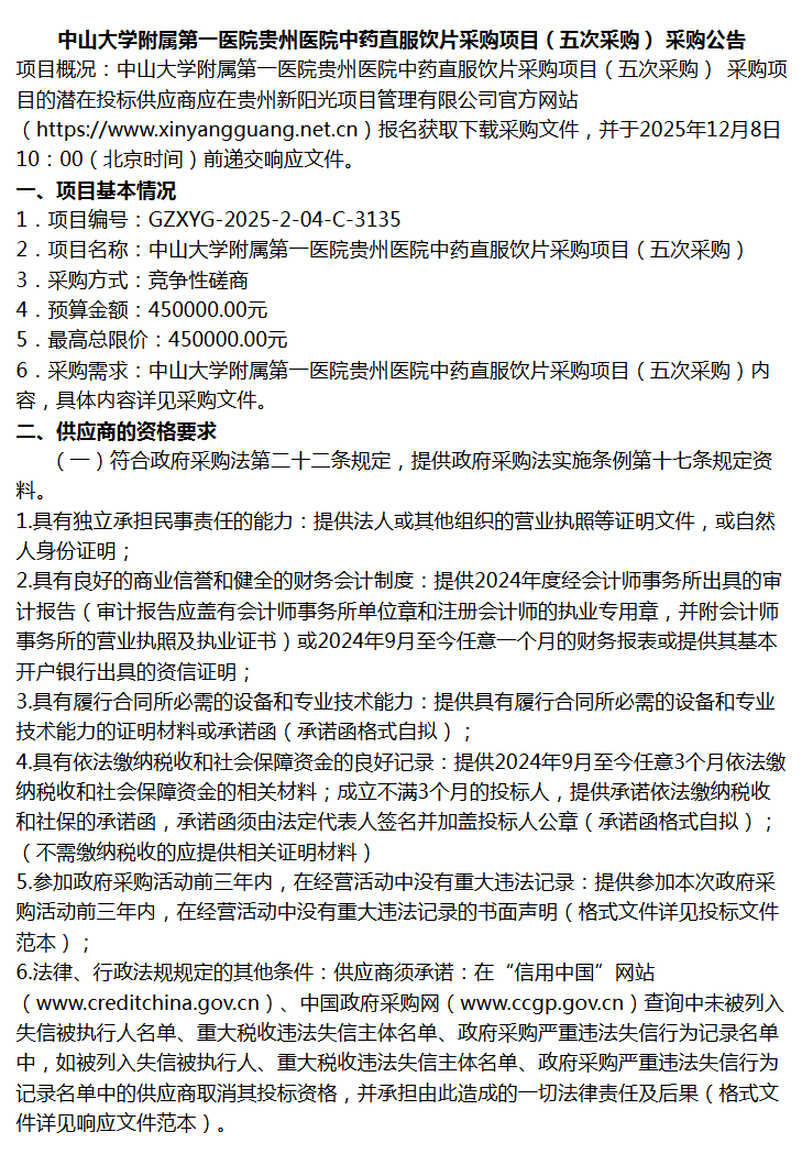 【中山大学附属第一医院贵州医院】中山大学附属第一医院贵州医院中药直服饮片采购项目(五次采购)采购公告