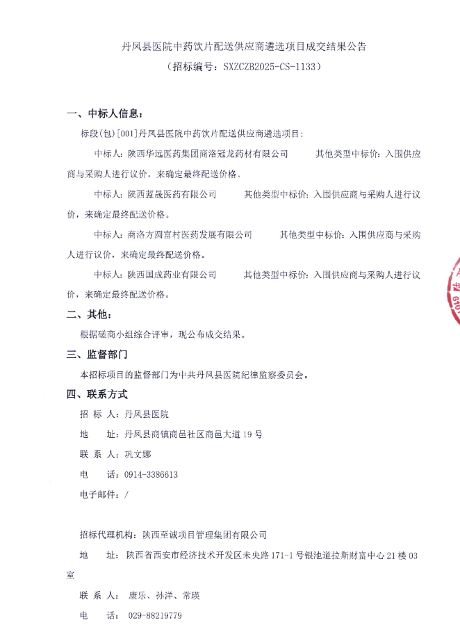 【商洛市丹凤县医院】陕西省商洛市丹凤县医院中药饮片配送供应商遴选项目成交结果公告(20251212)