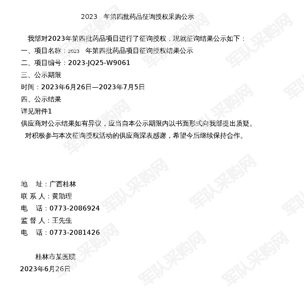 【军队采购】军队采购网2023年第四批药品征询授权采购公示(2023-JQ25-W9061)