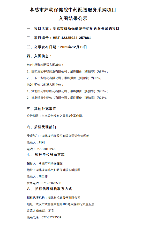 【孝感市妇幼保健院】湖北省孝感市妇幼保健院中药配送服务采购项目入围结果公示(HBT-12325024-257881-1)