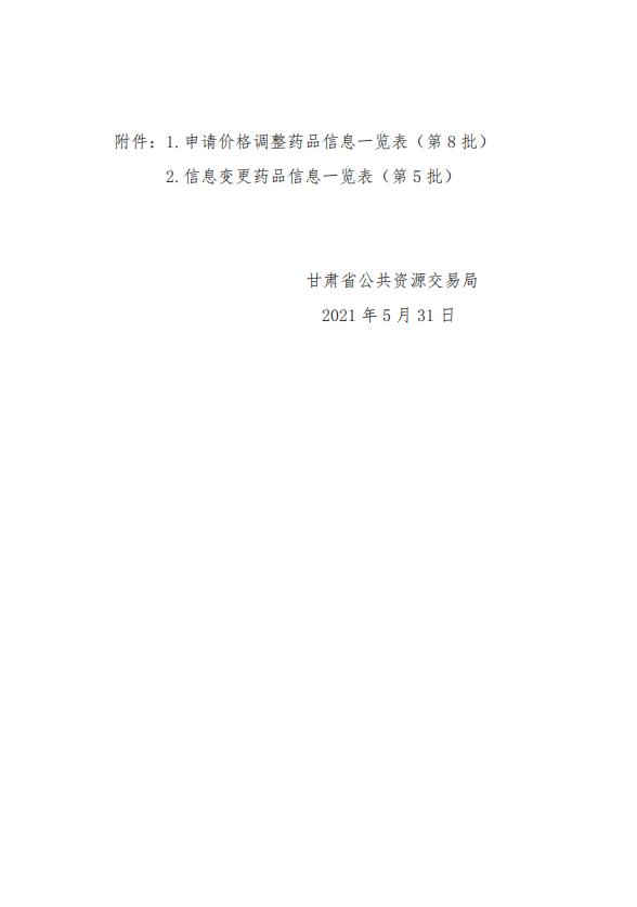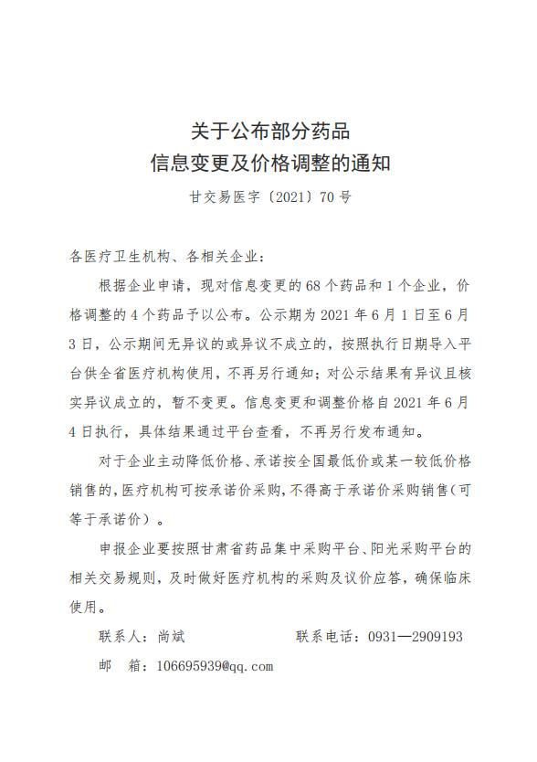 【甘肃】甘肃省关于公布部分药品信息变更及价格调整的通知(20210531)