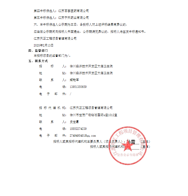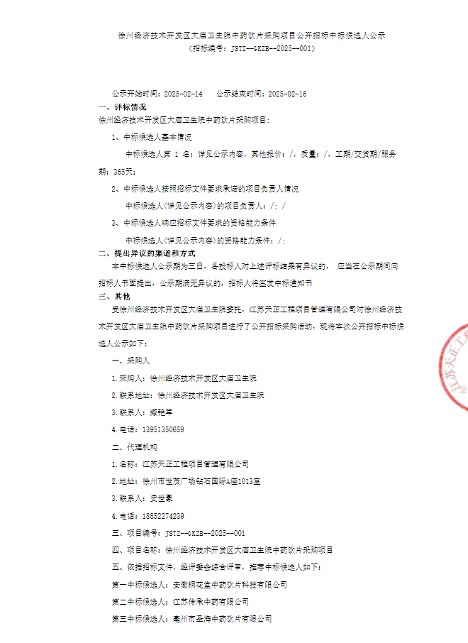 【徐州经济技术开发区大庙卫生院】江苏省徐州经济技术开发区大庙卫生院中药饮片采购项目公开招标中标候选人公示
