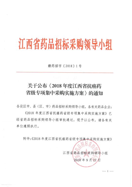 【江西】关于公布《2018年度江西省抗癌药省级专项集中采购实施方案》的通知