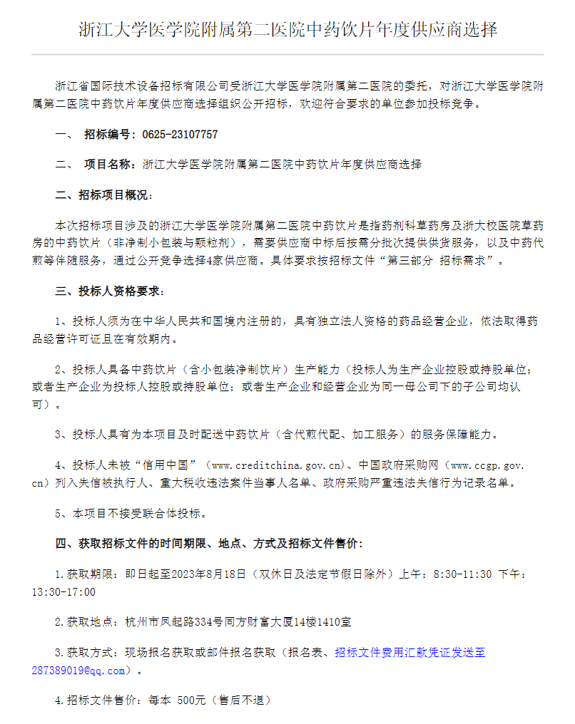 【浙江大学医学院附属第二医院】浙江大学医学院附属第二医院中药饮片年度供应商选择招标公告