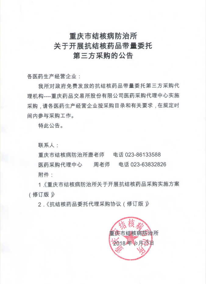 【重庆】重庆市结核病防治所关于开展抗结核药品带量委托第三方采购的公告