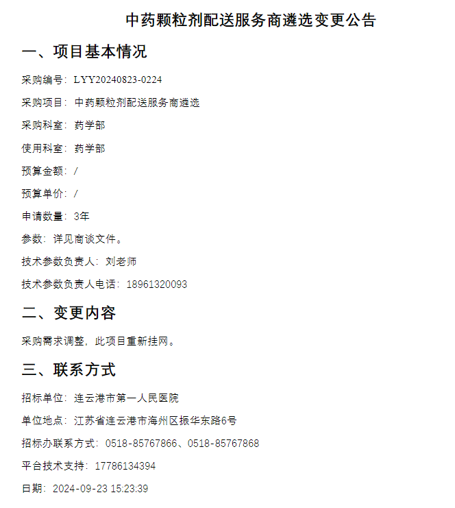 【连云港市第一人民医院】江苏省连云港市第一人民医院中药颗粒剂配送服务商遴选变更公告