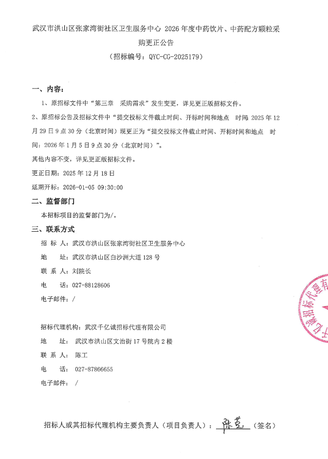 【武汉市洪山区张家湾街社区卫生服务中心】湖北省武汉市洪山区张家湾街社区卫生服务中心2026年度中药饮片、中药配方颗粒采购更正公告