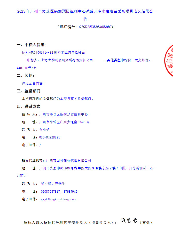 【广州市海珠区疾病预防控制中心】广东省2025年广州市海珠区疾病预防控制中心适龄儿童水痘疫苗采购项目成交结果公告