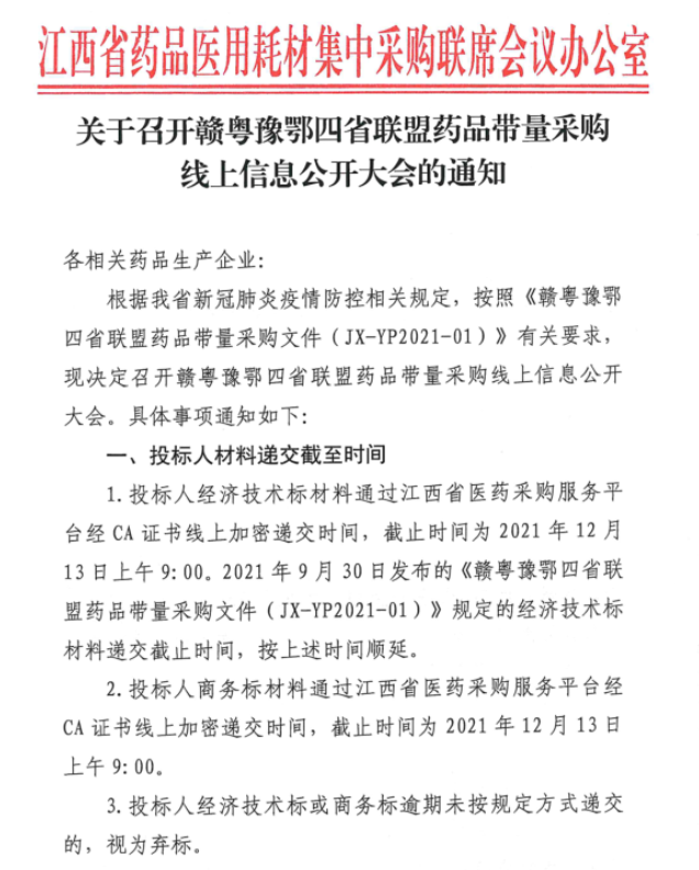 【江西】江西省关于召开赣粤豫鄂四省联盟药品带量采购线上信息公开大会的通知