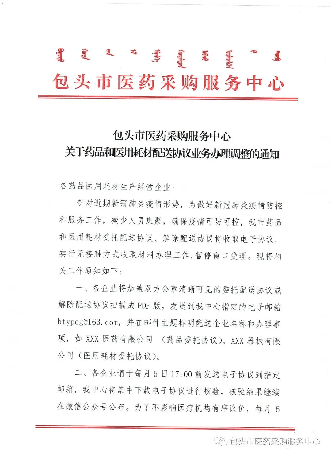 【包头】内蒙古自治区包头市关于药品和医用耗材配送协议业务办理调整的通知