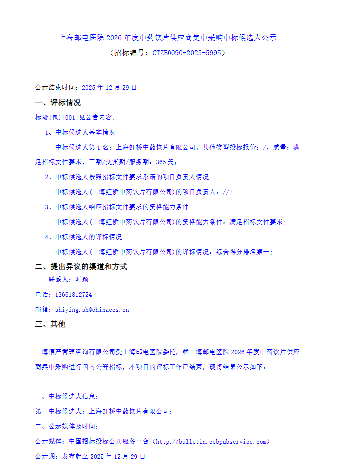 【上海邮电医院】上海邮电医院2026年度中药饮片供应商集中采购中标候选人公示