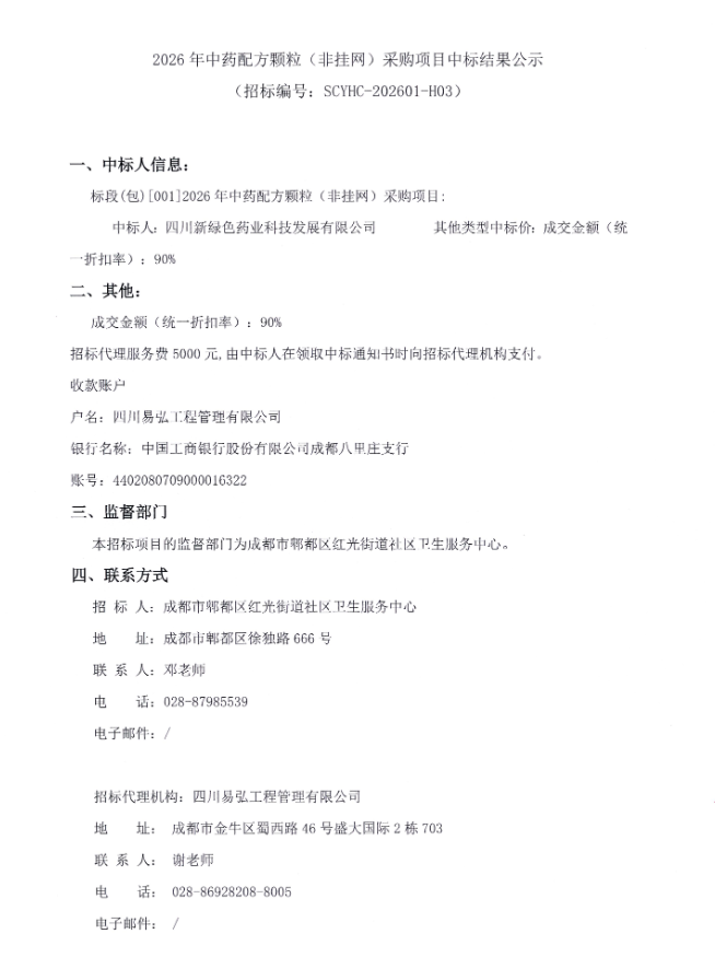 【成都市郫都区红光街道社区卫生服务中心】四川省成都市郫都区红光街道社区卫生服务中心2026年中药配方颗粒(非挂网)采购项目中标结果公示