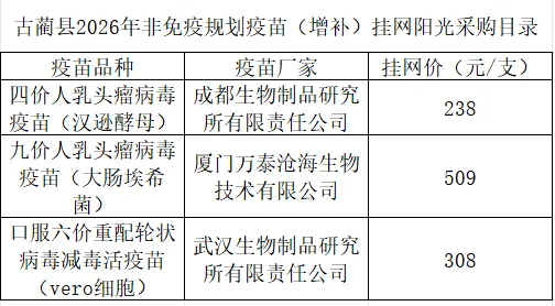 近期,四川省药械招采管理系统新挂网了非免疫规划疫苗,根据《古蔺县2025年非免疫规划疫苗比选方案》(蔺疾控〔2025〕32号)中目录选取规则,新增补以下疫苗进入古蔺县2026年非免疫规划疫苗采购目录。现将古蔺县2026年非免疫规划疫苗(增补)挂网阳光采购公示如下。