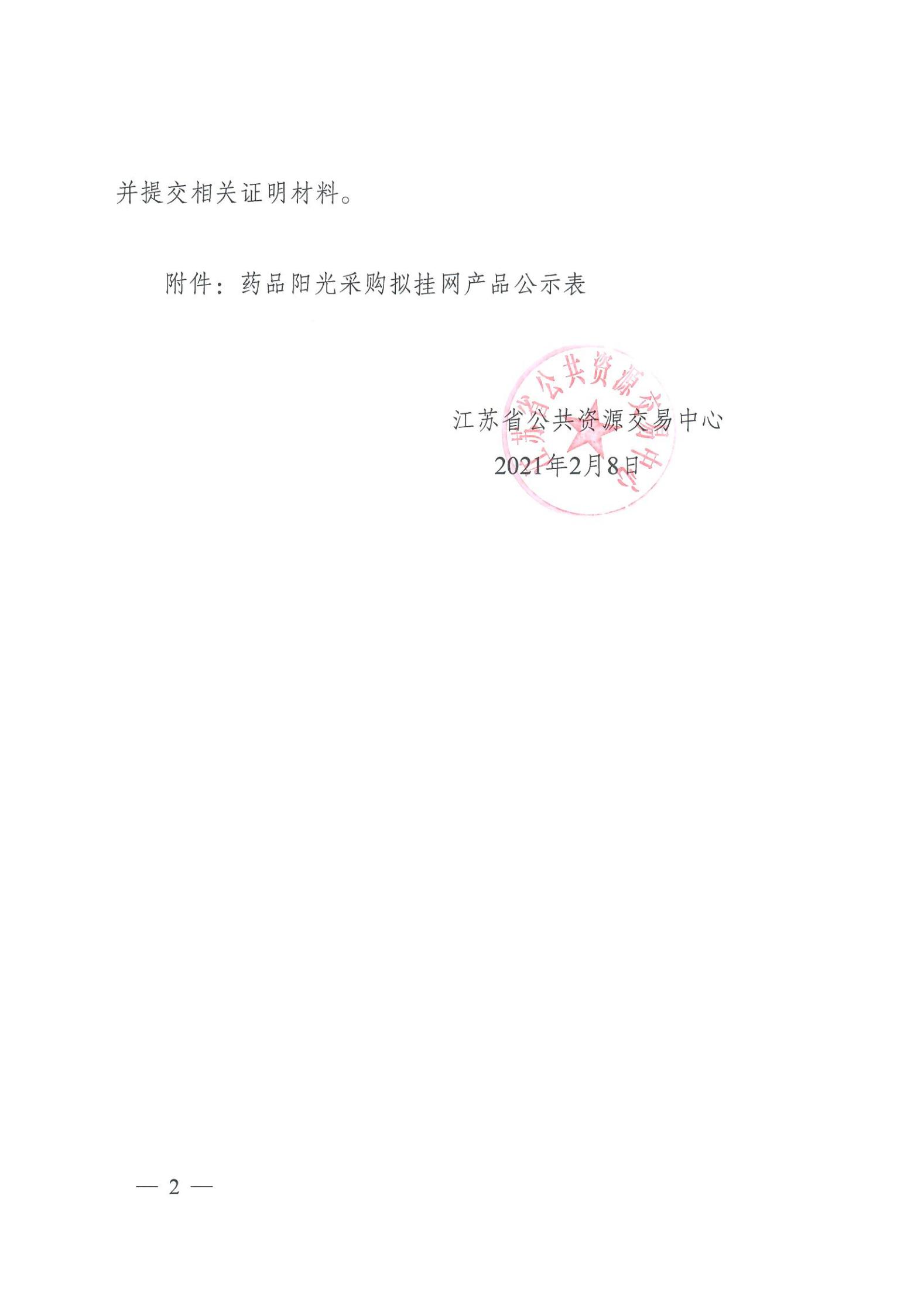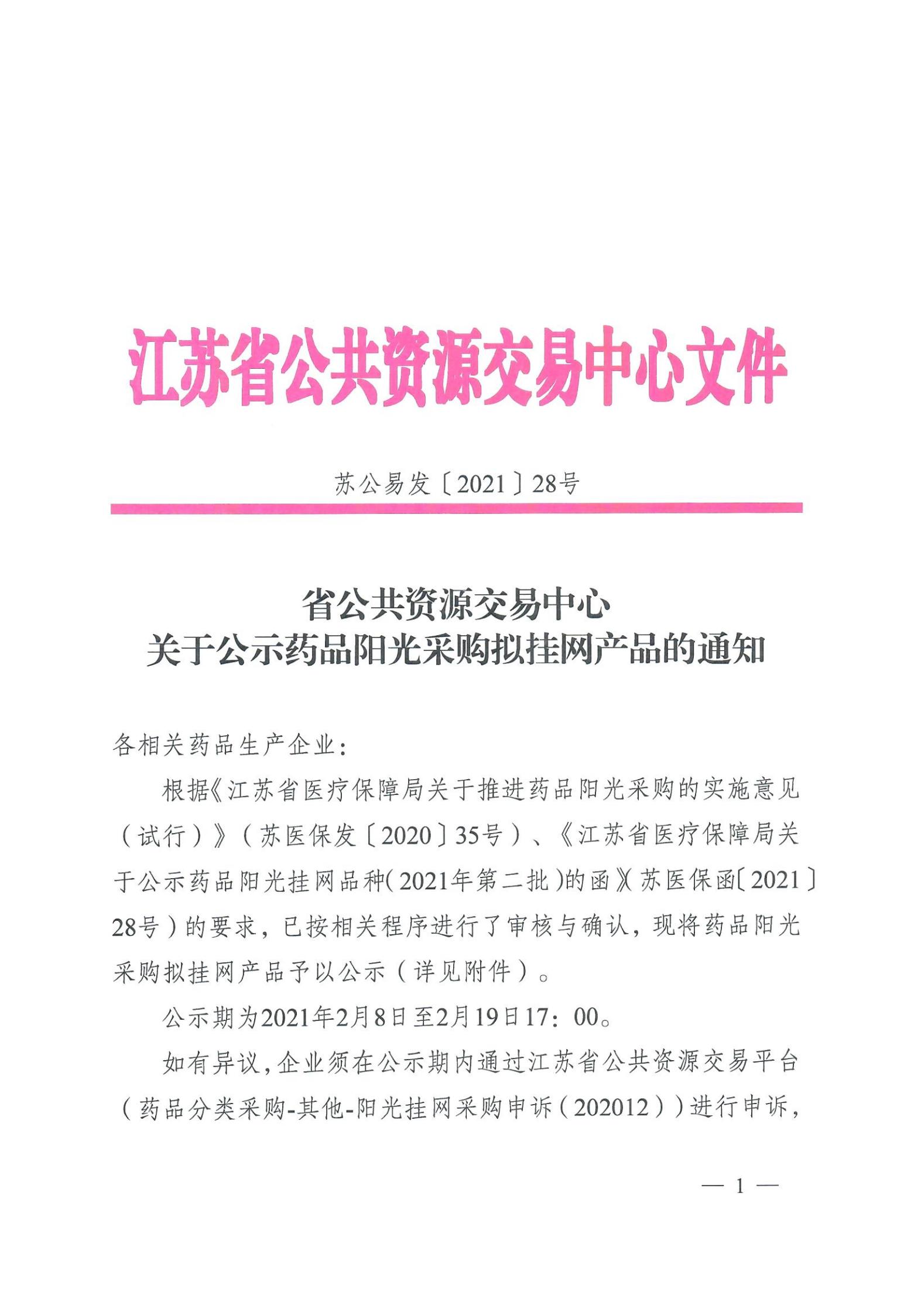 【江苏】2021年江苏省公共资源交易中心关于公示药品阳光采购拟挂网产品的通知 苏公易发[2021]28号