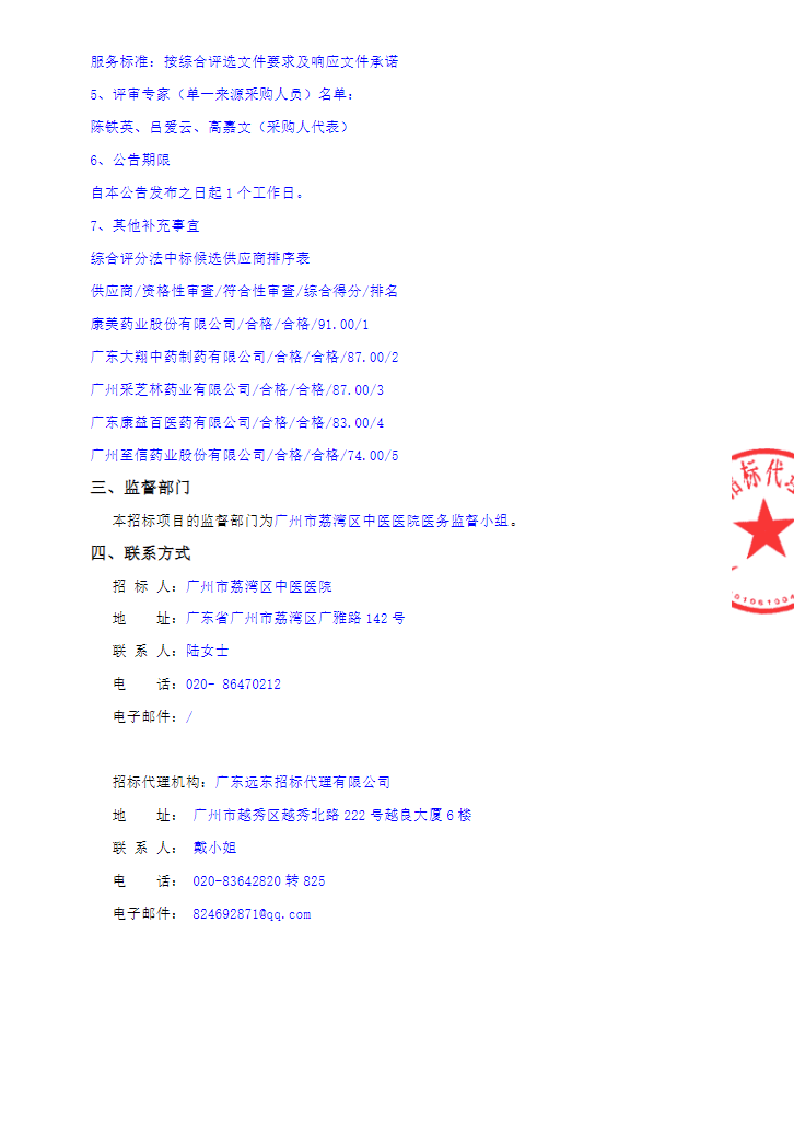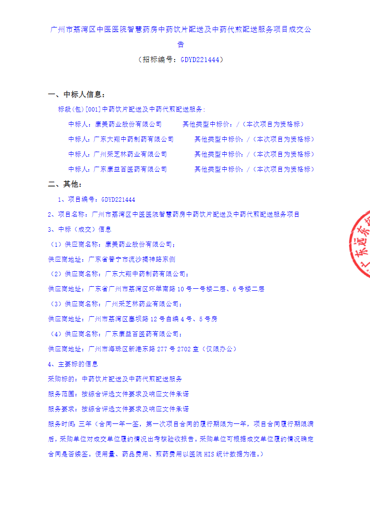 【广州市荔湾区中医医院】广东省广州市荔湾区中医医院智慧药房中药饮片配送及中药代煎配送服务项目成交公告