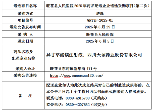 【广元市旺苍县人民医院】四川省广元市旺苍县人民医院2025年药品配送企业遴选采购项目(第二次)遴选结果公告