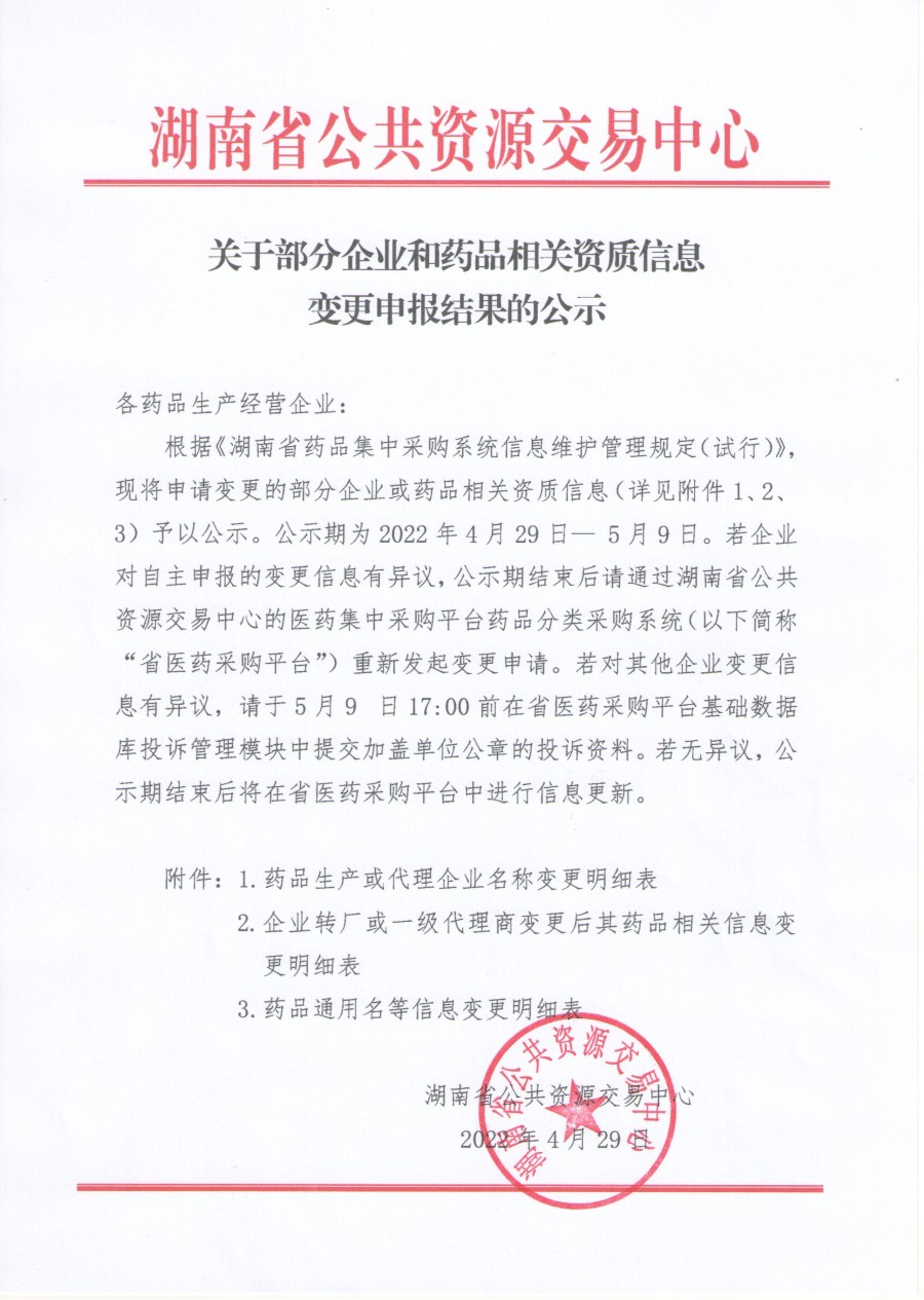 【湖南】湖南省关于部分企业和药品相关资质信息变更申报结果的公示(20220429)
