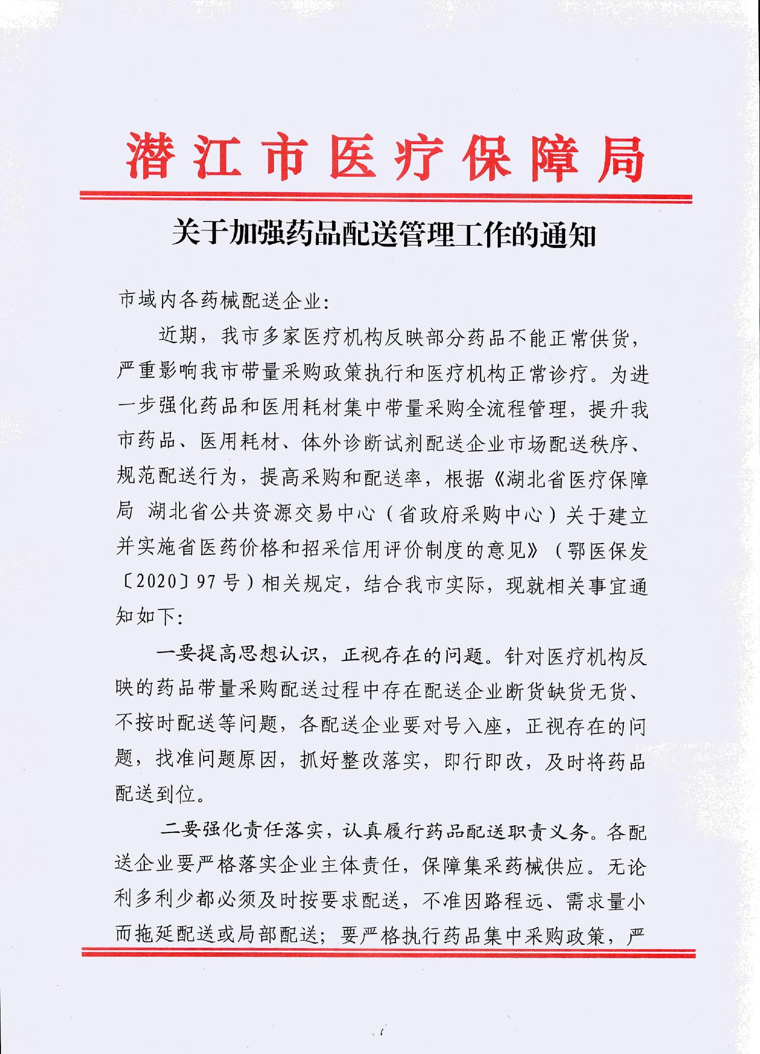 二要强化责任落实,认真履行药品配送职责义务。各配送企业要严格落实企业主体责任,保障集采药械供应。无论利多利少都必须及时按要求配送,不准因路程远、需求量小而拖延配送或局部配送;要严格执行药品集中采购政策,严禁进行“捆绑销售”等。除不可抗力因素外,对违反合同约定、配送不及时、影响临床使用的配送企业,我局将采取约谈、责令整改等管理措施,对逾期不改或有严重违规行为的,报省医疗保障局按规定取消配送资格,并纳入不诚信企业黑名单;对造成经济损失的,追究责任。