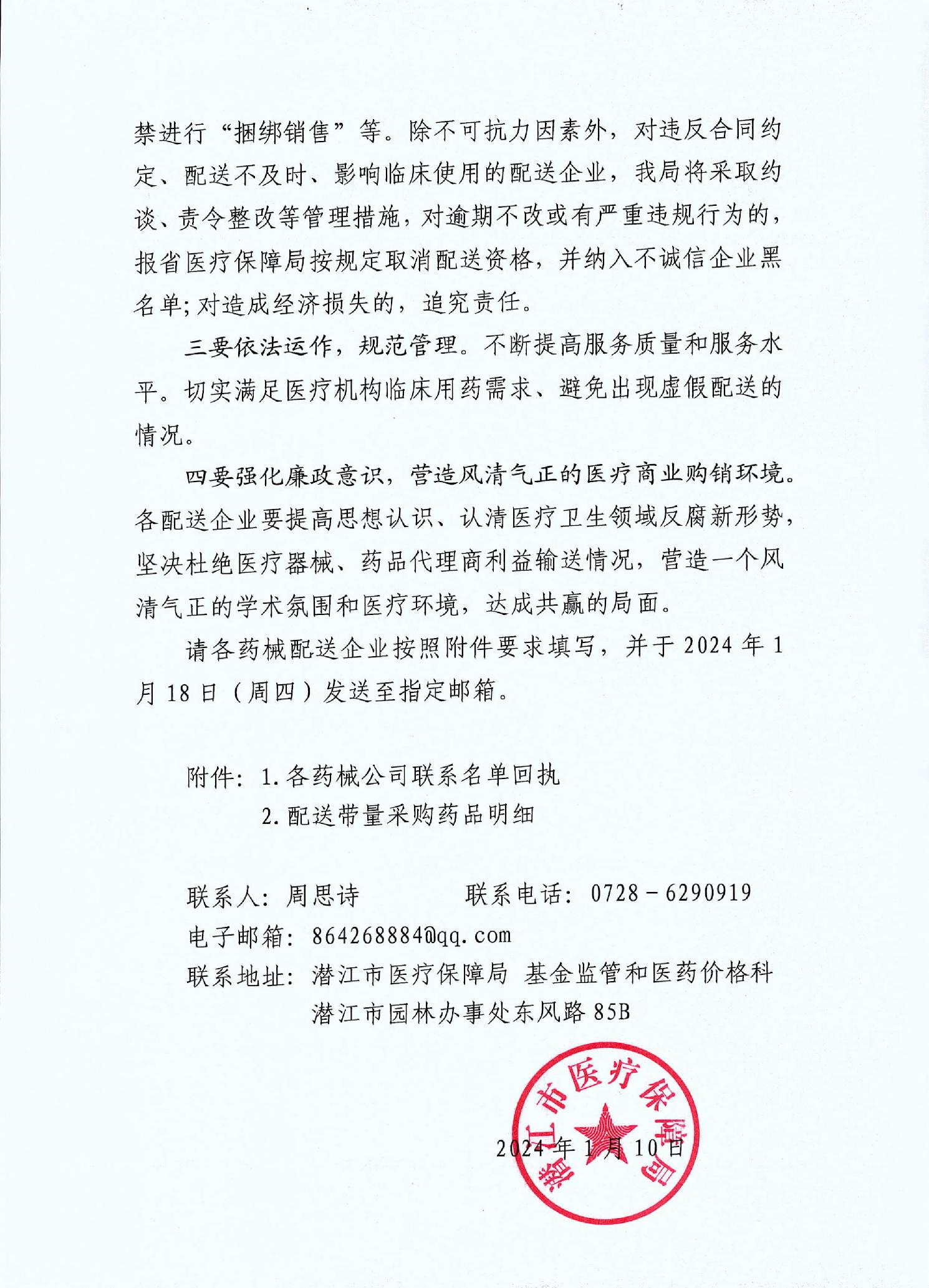 请各药械配送企业按照附件要求填写,并于2024年1月18日(周四)发送至指定邮箱。