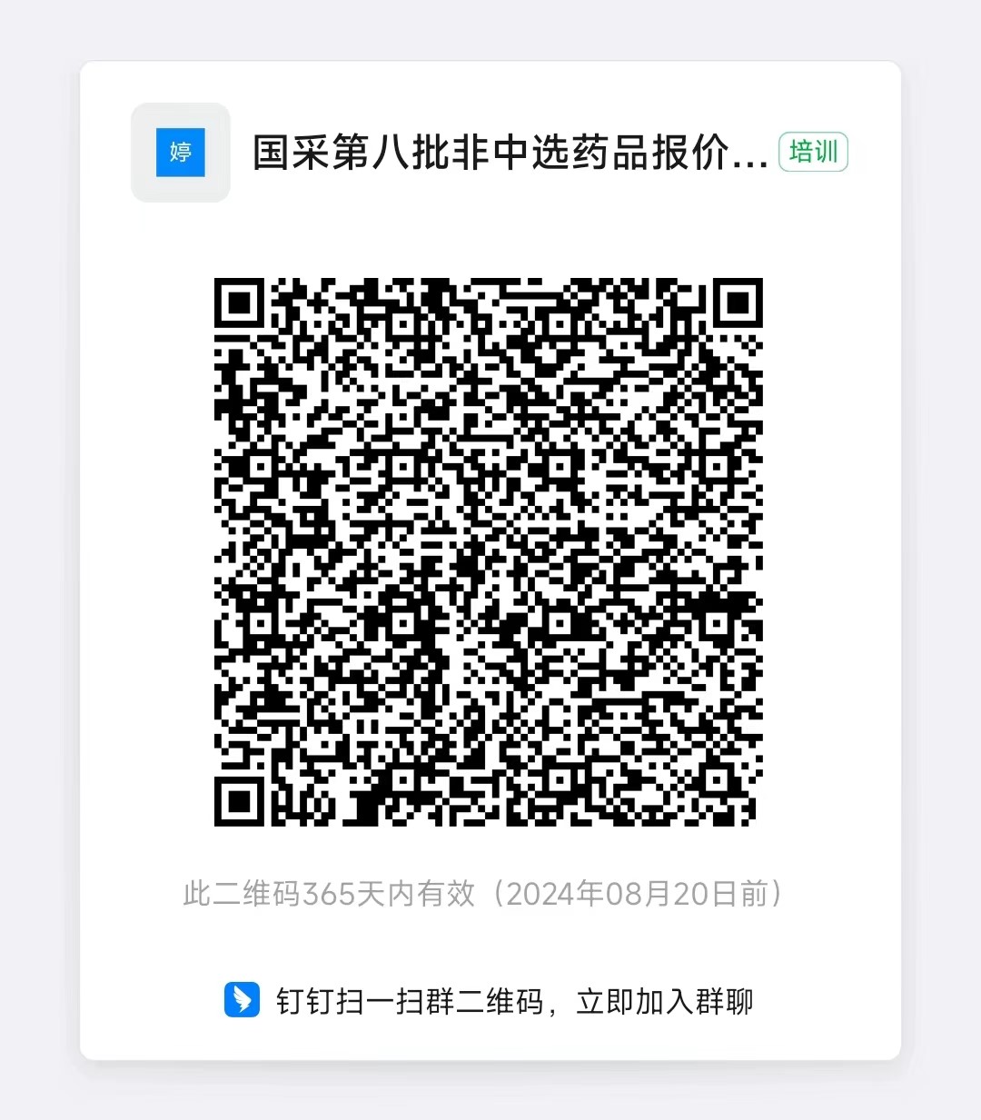 为方便企业开展报价工作,中心建立“国采第八批非中选药品报价咨询群”集中解答有关问题,相关企业人员可搜索下载“钉钉”APP,点击右上角“+”扫描下方群二维码加入,进行问题咨询。