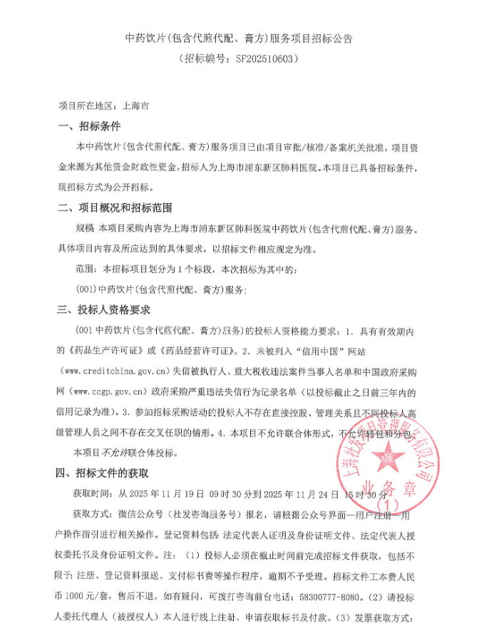 【上海市浦东新区肺科医院】上海市浦东新区肺科医院中药饮片(包含代煎代配、膏方)服务项目招标公告