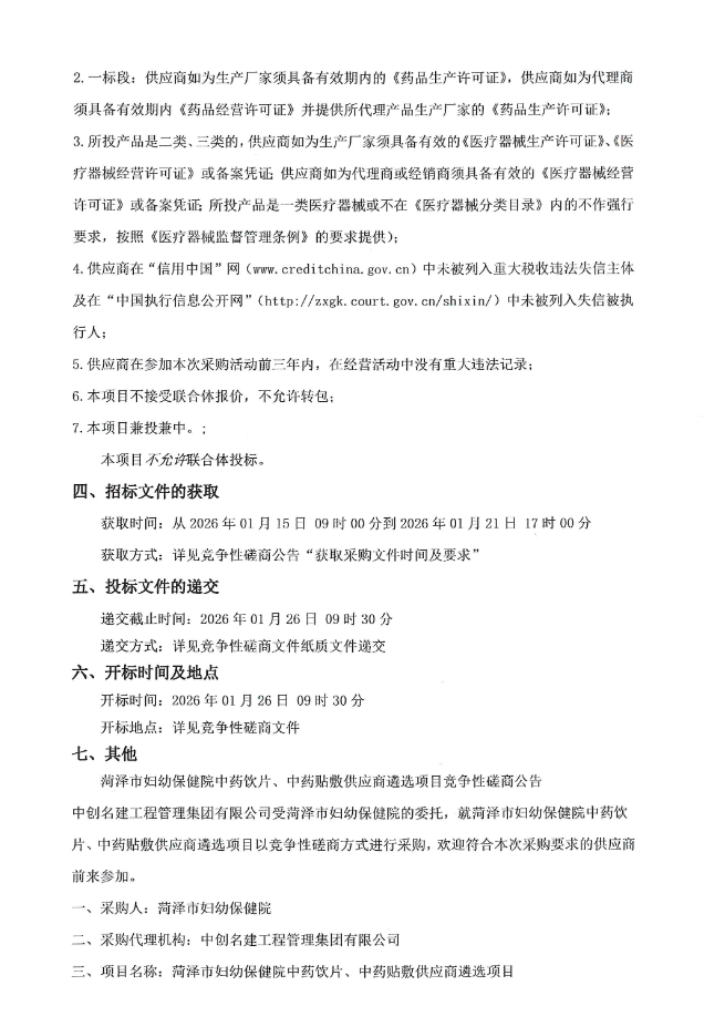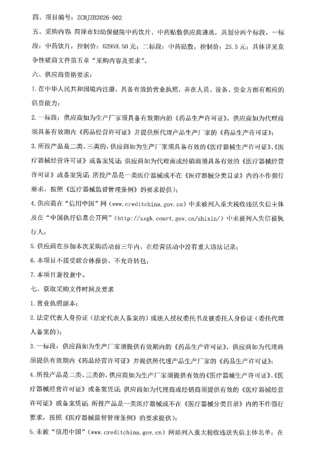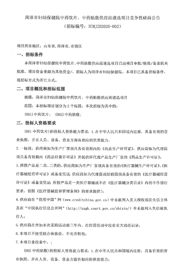 【菏泽市妇幼保健院】山东省菏泽市妇幼保健院中药饮片、中药贴敷供应商遴选项目竞争性磋商公告