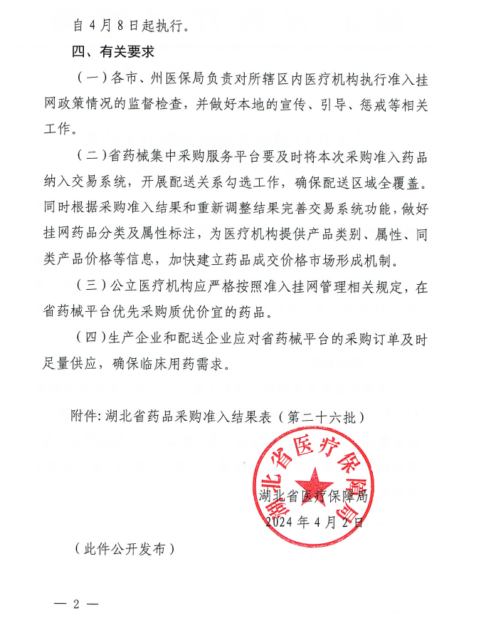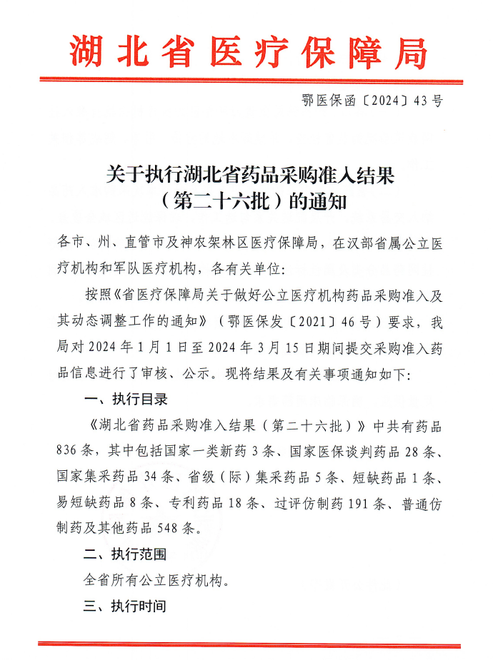 【湖北】关于执行湖北省药品采购准入结果(第二十六批)的通知
