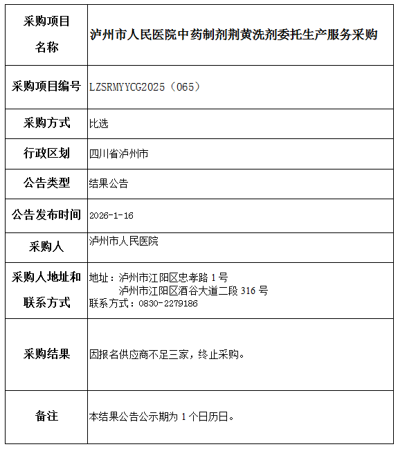 【泸州市人民医院】四川省泸州市人民医院中药制剂荆黄洗剂委托生产服务采购结果公告