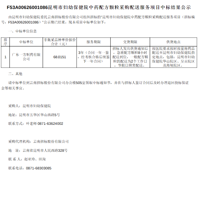 【昆明市妇幼保健院】云南省昆明市妇幼保健院中药配方颗粒采购配送服务项目招标结果公告