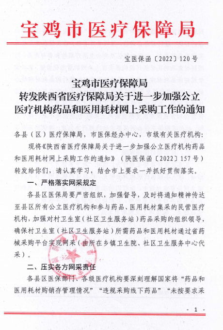 【宝鸡】陕西省宝鸡市人民政府转发陕西省医疗保障局关于进一步加强公立医疗机构药品和医用耗材网上采购工作的通知