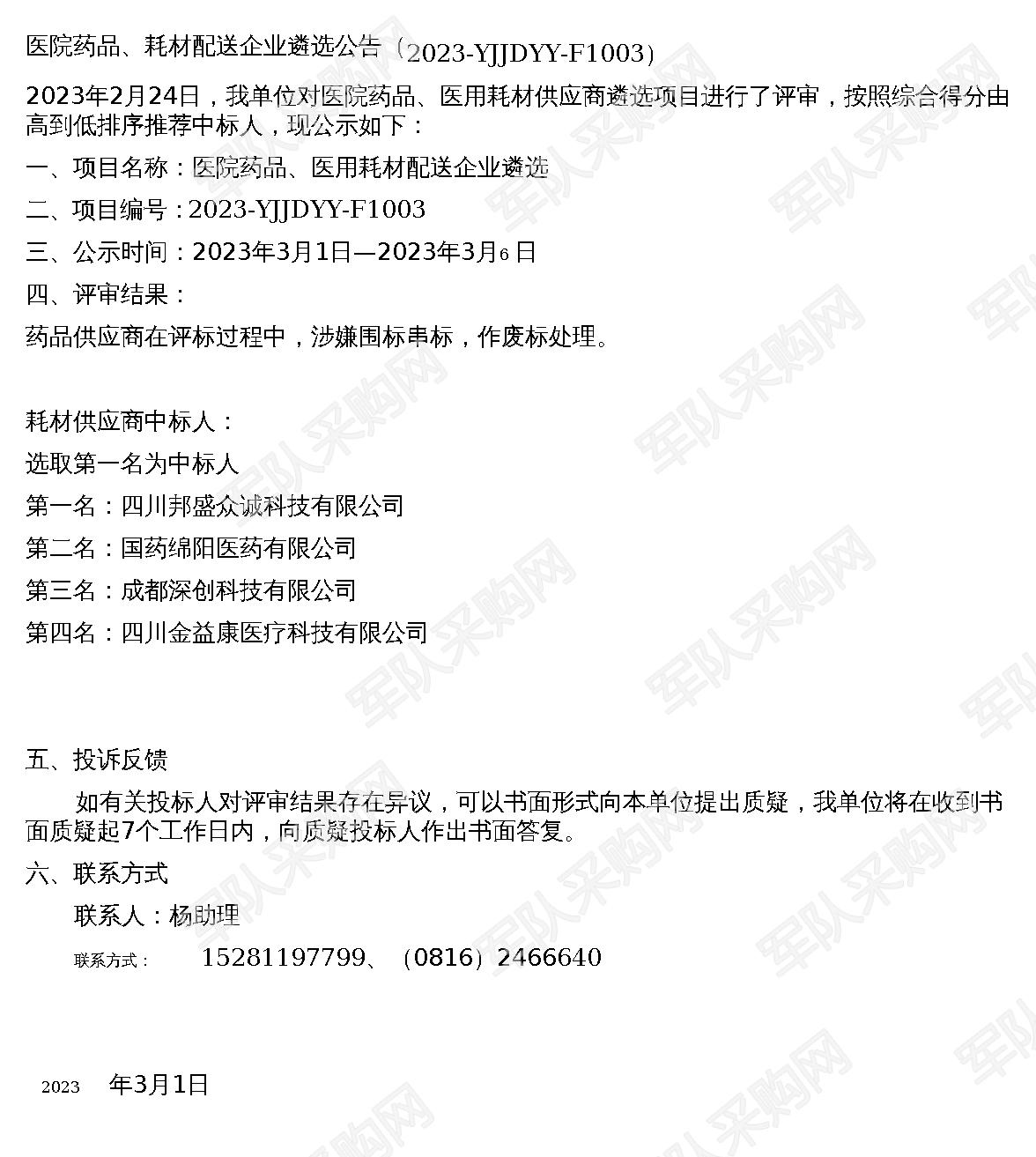 【军队采购】军队采购网医院药品、耗材配送企业遴选公告(2023-YJJDYY-F1003)