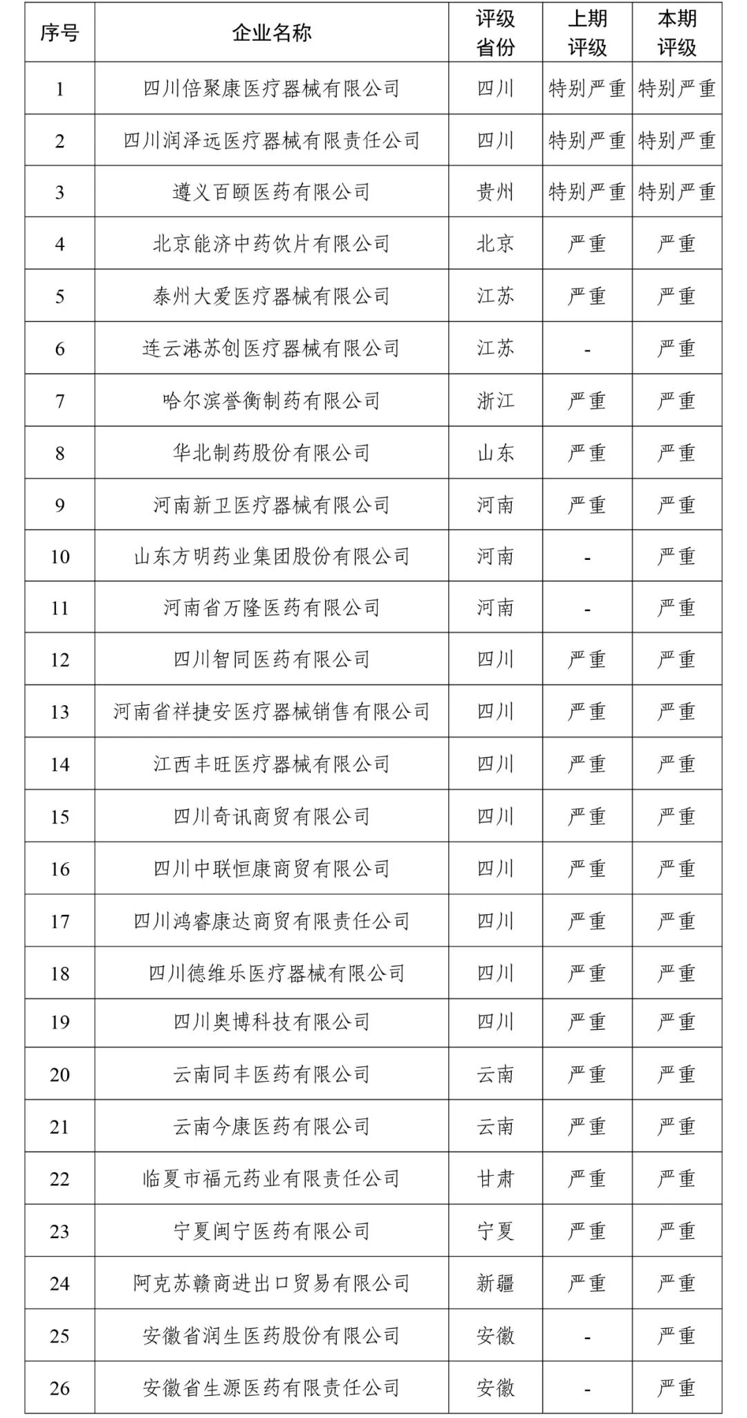 受国家医疗保障局委托,国家医疗保障局医药价格和招标采购指导中心汇总了2023年9月30日各省份评级为“特别严重”和“严重”失信的医药企业情况,现公告如下。