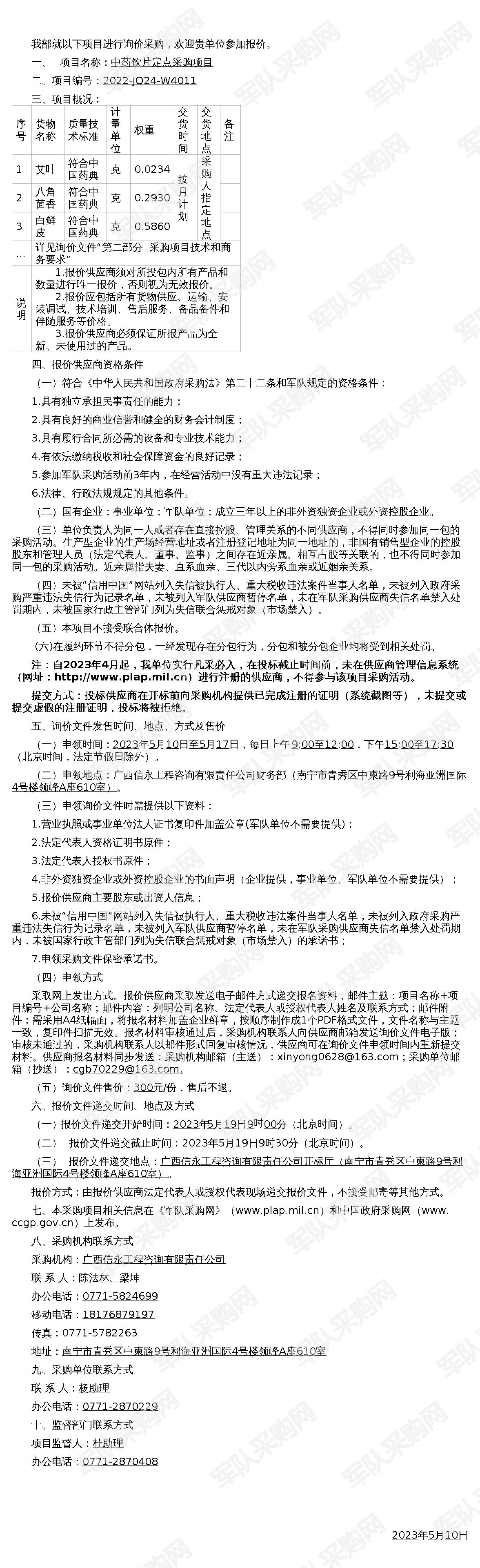 【南宁市某医院】军队采购网南宁市某医院中药饮片定点采购项目询价邀请书(项目编号:2022-JQ24-W4011)