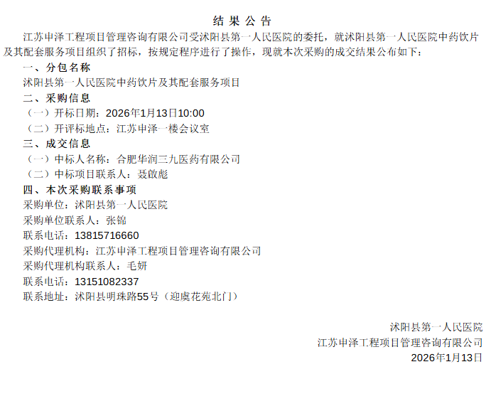【宿迁市沭阳县第一人民医院】江苏省宿迁市沭阳县第一人民医院中药饮片及其配套服务项目中标公示