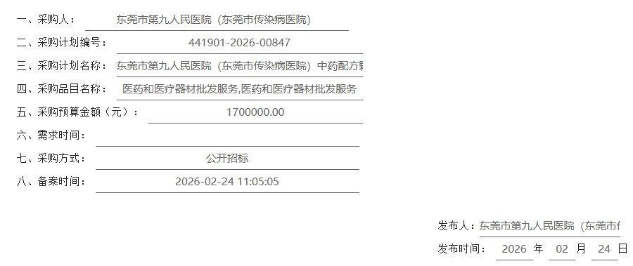 【东莞市第九人民医院】广东省东莞市第九人民医院(东莞市传染病医院)中药配方颗粒、中药饮片供应服务及代煎服务采购项目