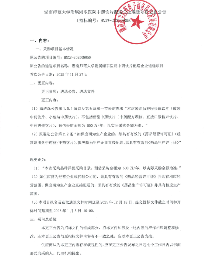 【湖南师范大学附属湘东医院】湖南师范大学附属湘东医院中药饮片配送企业遴选项目更正公告