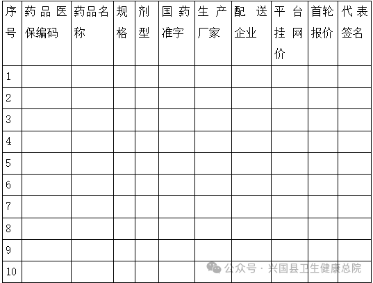4.填写好附件2《兴国县卫生健康总院第三轮线下议价药品报价表》(首轮报价不得高于江西省药品和医用耗材招采管理系统挂网价格且不高于兴国县内当前的供货价格)。