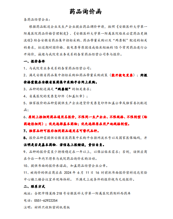 【安徽医科大学第一附属医院】安徽医科大学第一附属医院药品询价函(2024年第四次)