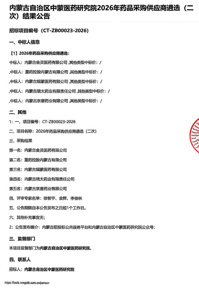 【内蒙古自治区中蒙医药研究院】内蒙古自治区中蒙医药研究院2026年药品采购供应商遴选(二次)结果公告