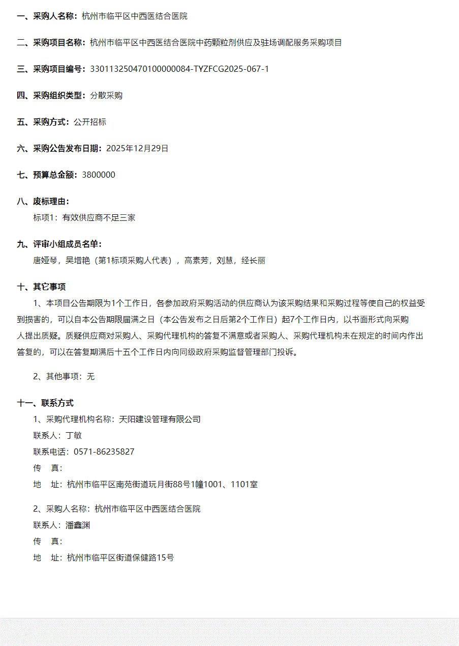 【杭州市临平区中西医结合医院】浙江省天阳建设管理有限公司关于杭州市临平区中西医结合医院中药颗粒剂供应及驻场调配服务采购项目废标公告
