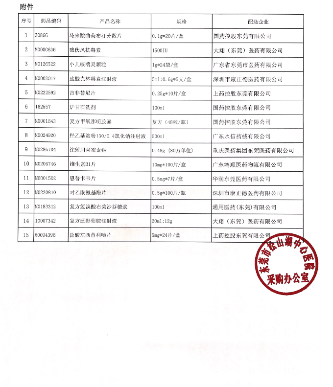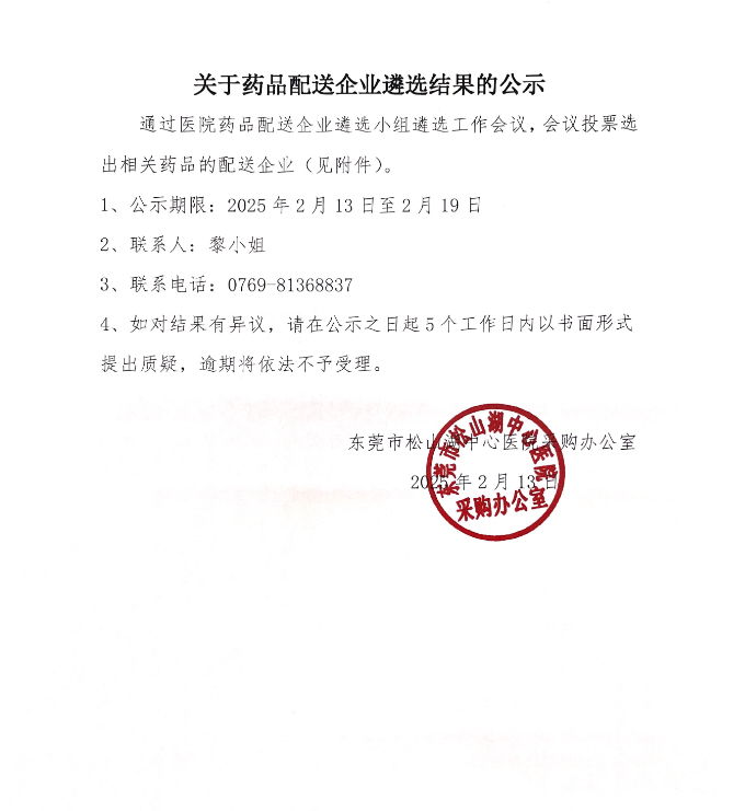 【东莞市松山湖中心医院】广东省东莞市松山湖中心医院药品配送企业遴选公示2025-02-13